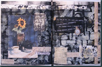 The hospitali-tea theme for Heidi’s book has been fun. It has brought to mind all the fun tea-parties I’ve attended over many years - first as a child, then a mother, and now a grandma. We could all stand to have more of the simple joy of a child’s tea-party. On the left page I transferred a photo of 2 little girls entertaining each other and their doll. Weeks ago I found some colorful photos of china in Sheila’s [thanks] stash and I collaged these on the right side along with a quote from George Gissing, “the mere chink of cups and saucers tunes the mind to happy repose”.